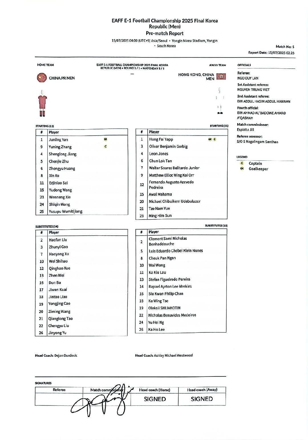 北京时间7月15日15:00,东亚杯小组赛第三轮,中国队对阵中国香港,本场比赛在龙仁龙体育场举行,赛前双方公布首发阵容: